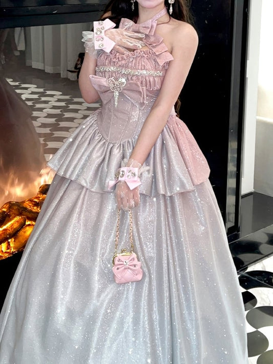 Shimmering Gradient Pink Halter Neck Sweetheart Neckline Top + Long Skirt Birthday Ball Gown