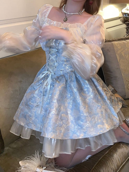 Painting Blue Waist Dress Detail Lace-Up Chiffon Oil with Shimmering Style