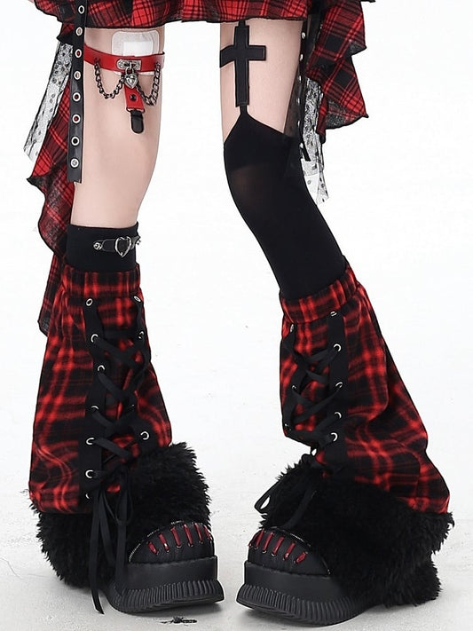 Red Lace-up Plaid with Design Gothic Bottom Leg Warmers Black Fuzzy Cuff