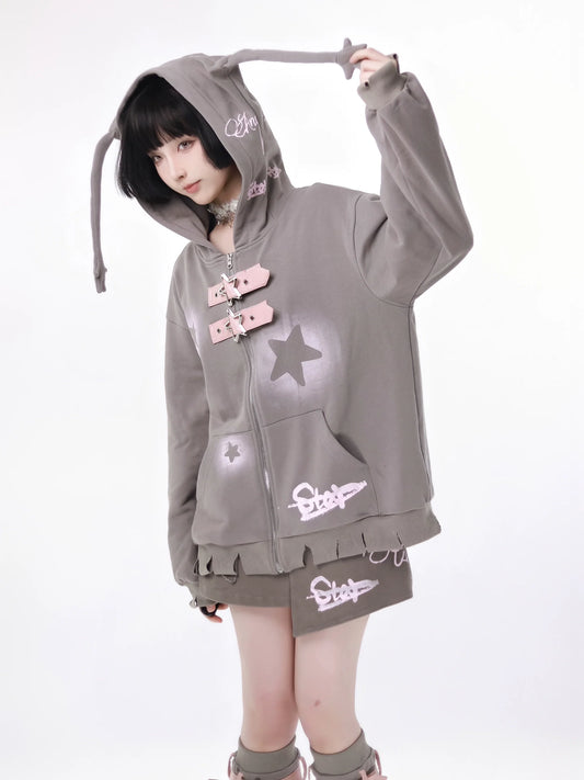 Star American Print Loose Zip Hoodie + Irregular Skirt + Leg Warmers