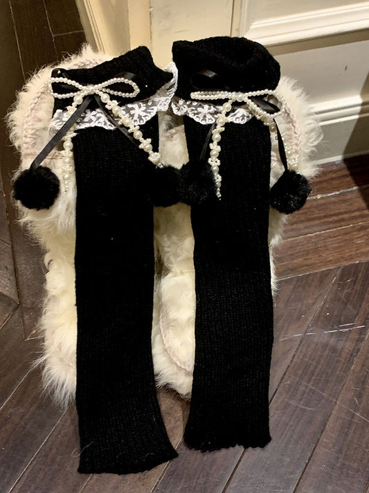 Black Y2K Bowknot Plush Cuffs Leg Warmers With Pompons
