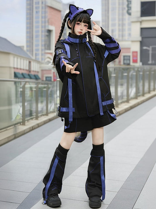 Purple Striped Futuristic Cyber Fashion Black Outfit - Baggy Windbreaker + Straight-leg Shorts/Pants + Leg Warmers Full Set