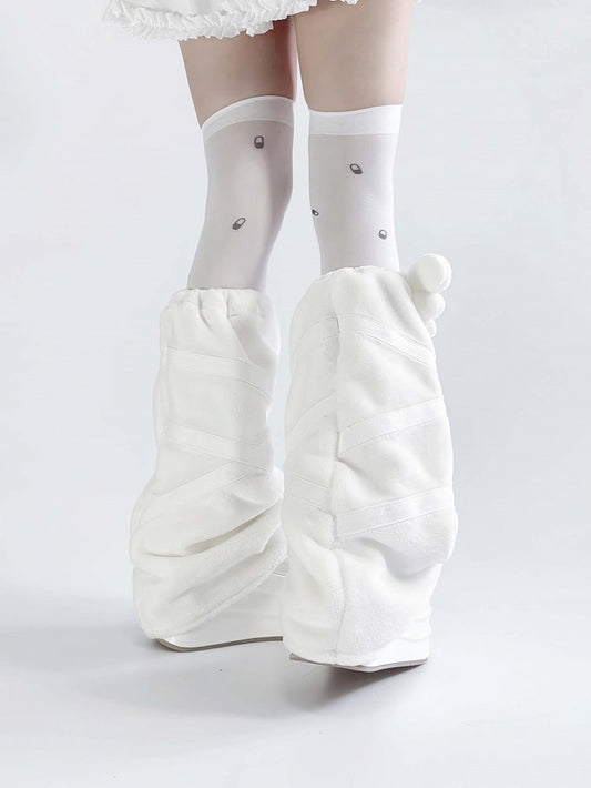 White Lolita Shaggy Cuffs Leg Warmers With Heart-shaped Pompons
