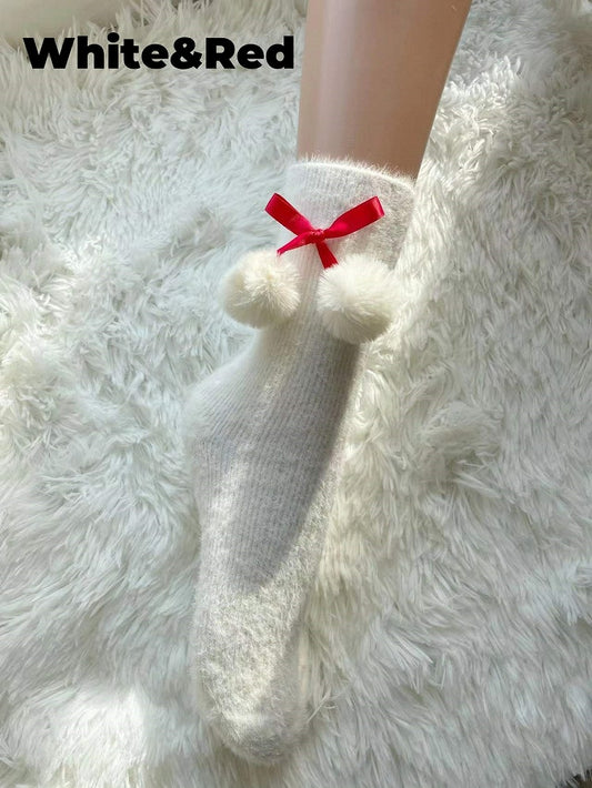 6 Options Red/White Bow Pompons Ankle/Calf Socks