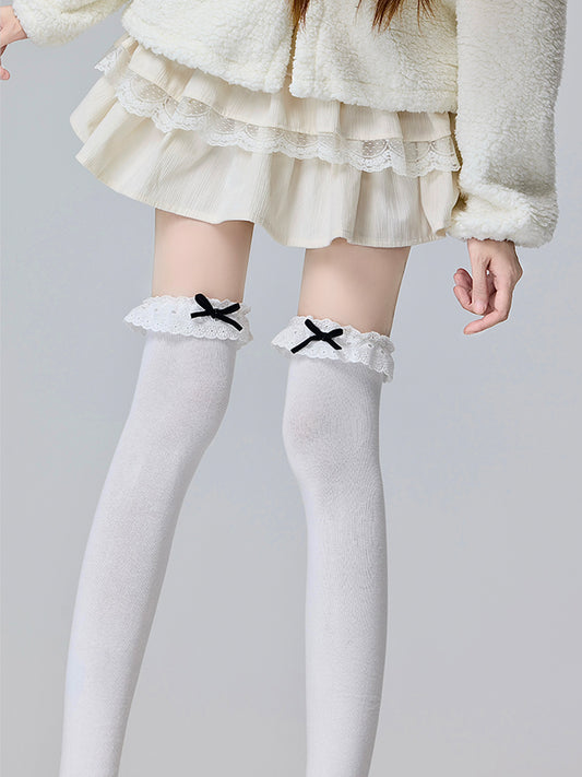 Black/White Lolita Bowknot Lace Details Overknee Stockings