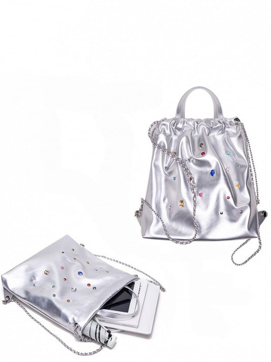 Glamorous Silver Drawstring Backpack With Rhinestone Embellishments