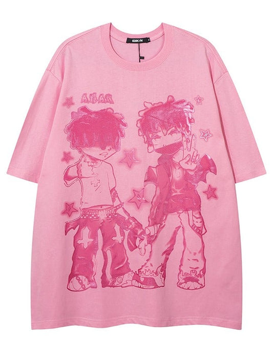 Loose-Fit Anime Character Graphic Tee - Flattering and Stylish White/Black/Pink