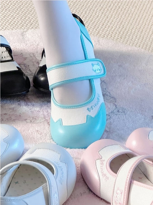 Janes Cat Embroidery Green Kitty Velcro Cute Mary - Flats Ear Closures Toe Round Featuring