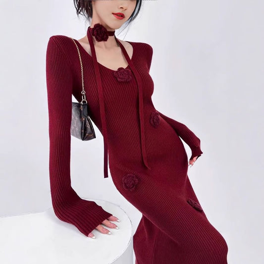 Set: Long-Sleeve V-Neck Plain Floral Accent Midi Sheath Knit Dress + Skinny Scarf