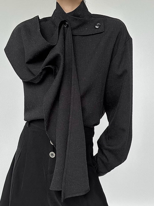 Front Placket Shawl Black Top with Scarf Asymmetrical Button Textured
