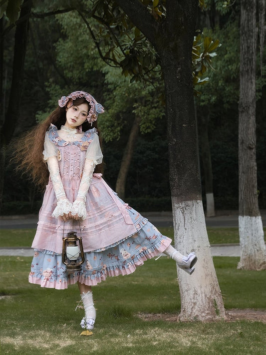 Print Cookie + Pink Headscarf Full Lolita Dress Brooches Sweet and Apron Blue Set Triangular Hamster