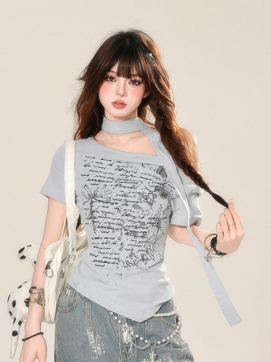 Grey Letters Off-the-shoulder Neckline Cropped Top with Free Scarf
