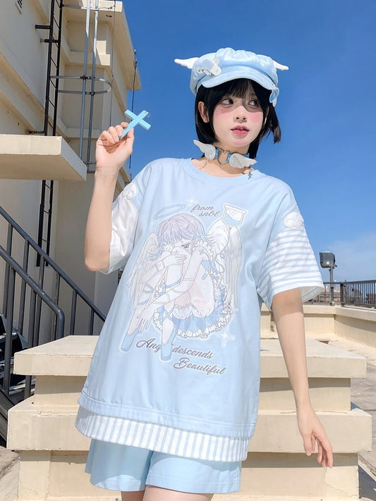 Blue Anime Girl Print Wing Appliques T-Shirt with Striped Scarf