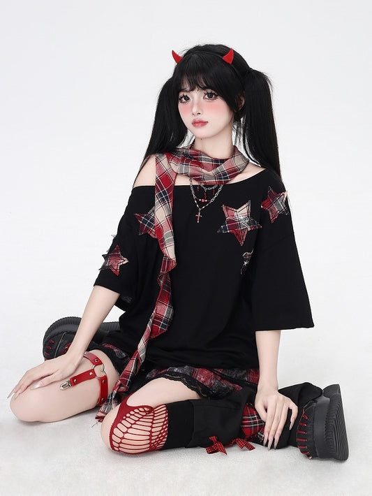 Glamorous Scarf Neckline with T-Shirt Red Plaid Star Appliques Black Asymmetrical