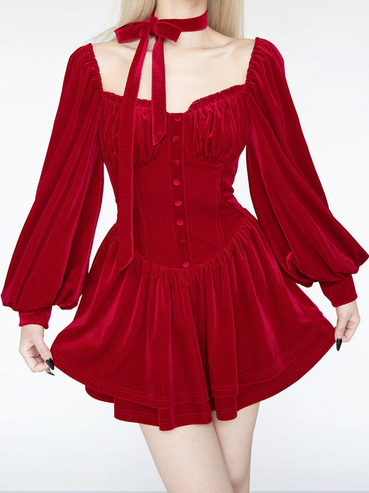 Red Velvet Balloon Sleeves Glamorous Tiered Skirt Mini Dress with Self-tie Scarf