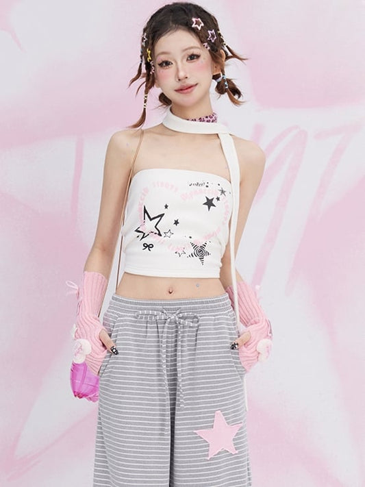 Black/White Stars Print Strapless Top with Free Scarf