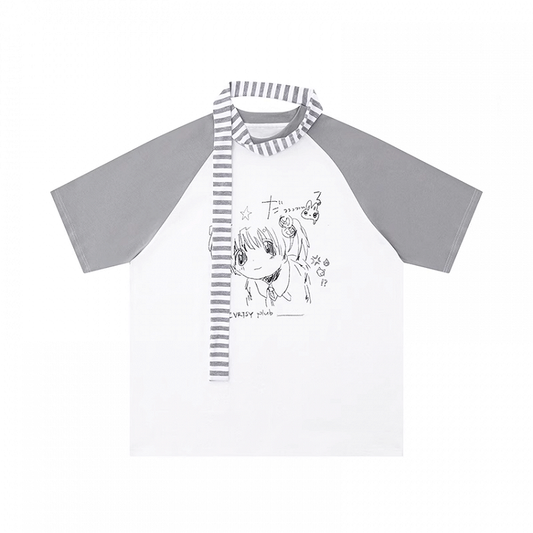 Anime Girl Graffiti T-Shirt Scarf with Striped Grey Colorblock Design