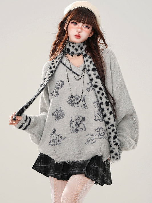 Grey Puppies V-neck Loose Sweater with Free Scarf