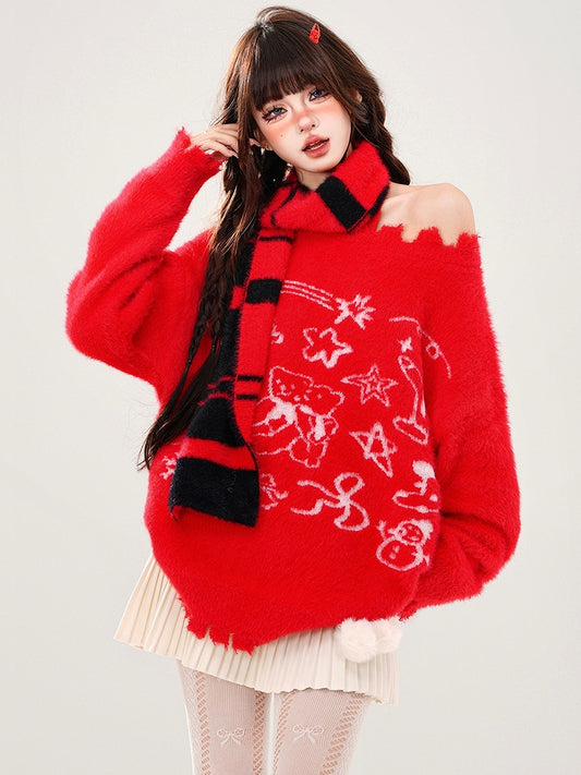 Red Bears and Stars Halter Neck Loose Sweater with Free Scarf