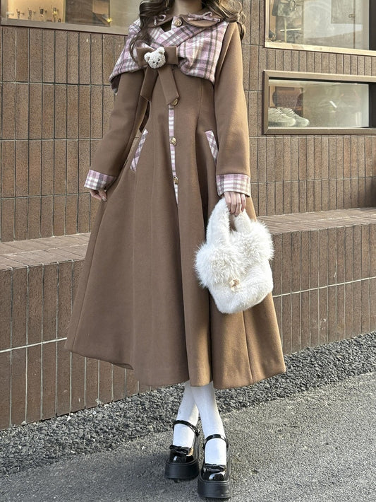 Brown Sweet Vintage Preppy Style Bow Accent Long Coat with Plaid Scarf Details