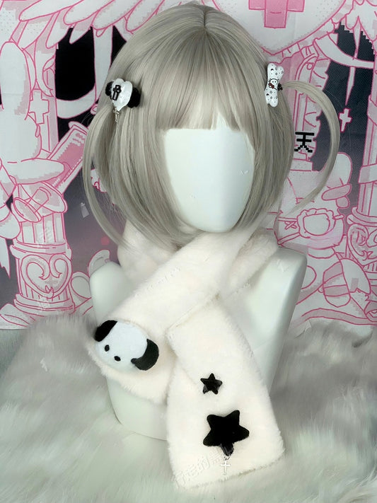 White & Black Cross Plush Scarf with Panda Puppy Plushie