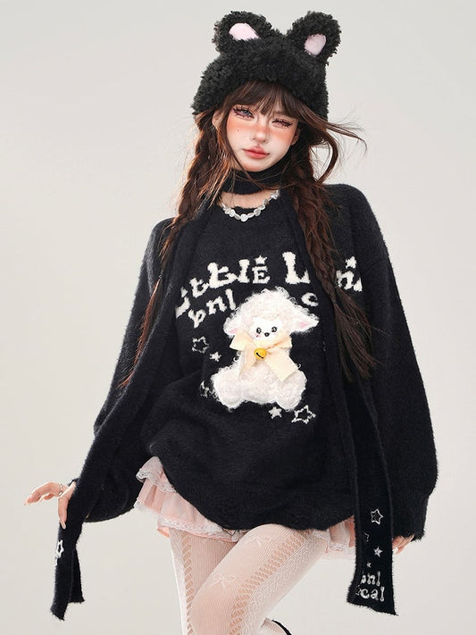 Red/Black Cute Lamb Appliques Loose Sweater with Free Scarf