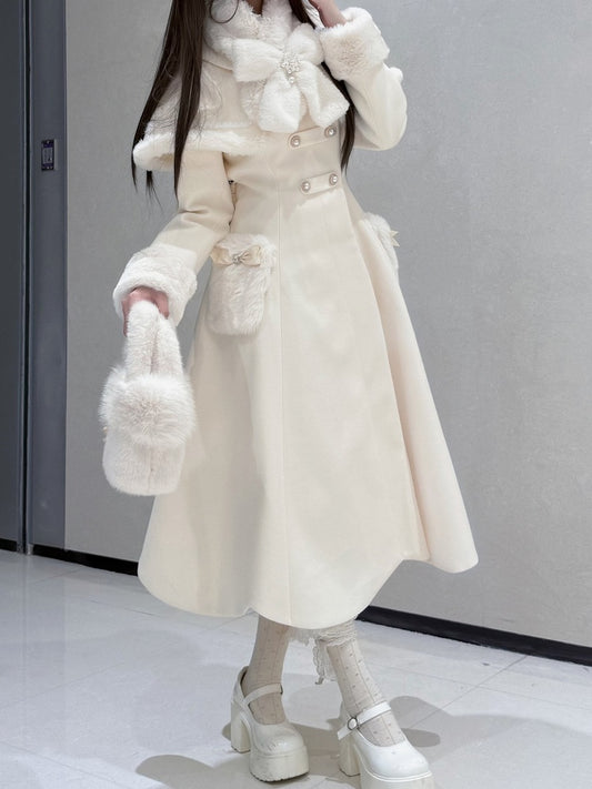 Apricot Cape Scalloped Edge Trim Lolita Coat with Plush Bowknot Scarf