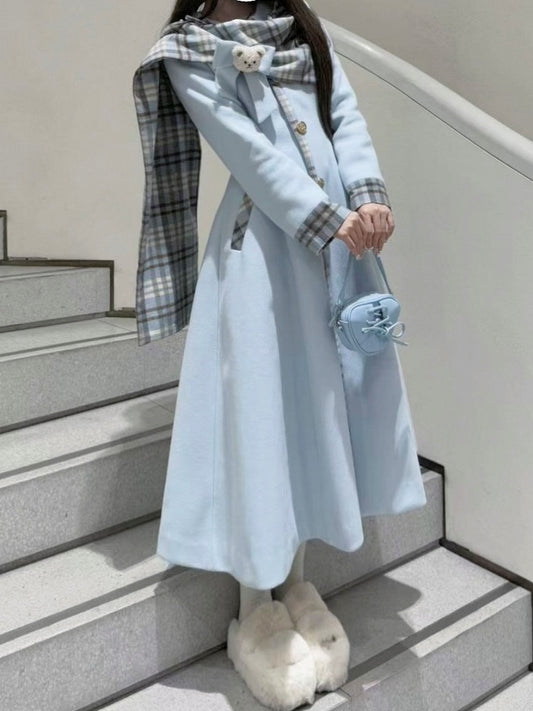 Blue Sweet Vintage Preppy Style Bow Accent Long Coat with Plaid Scarf Details