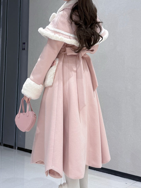 Pink Cape Scalloped Edge Trim Lolita Coat with Plush Bowknot Scarf