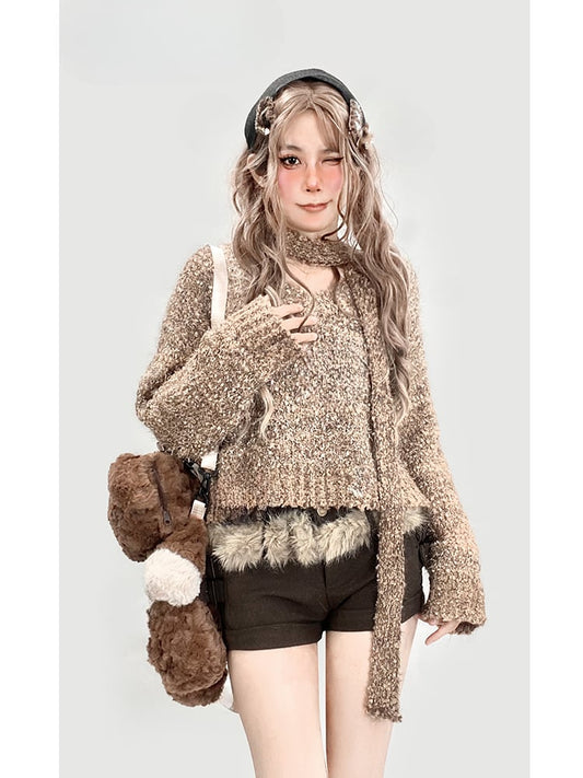 Apricot/Pink Cute Animal Bows Adorned Mohair Sweater with Free Striped Scarf