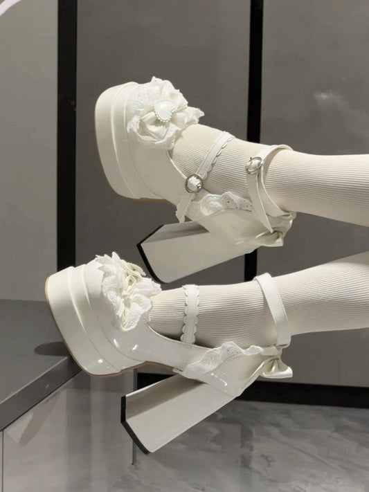 Heel Shoes Mary Lace Accents Bow Lolita Platform High with Sweet Jane and Trim White Block
