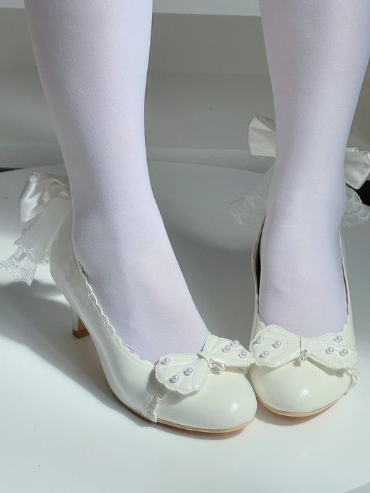 White Lolita Beads with Mid-Heel Bow - Scalloped Shoes Shell Elegant Inspired Details Edge