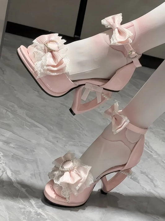 with Beaded Lolita Pink Shoes High-heel Hime Embellishments