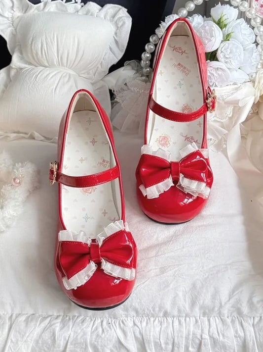 in Details PU at Lolita Red Lace Top Shoes with Mid-heel Sweet Bow
