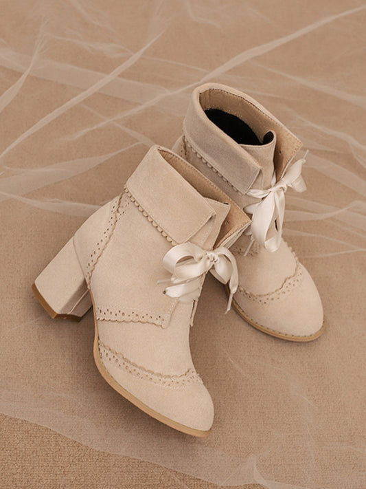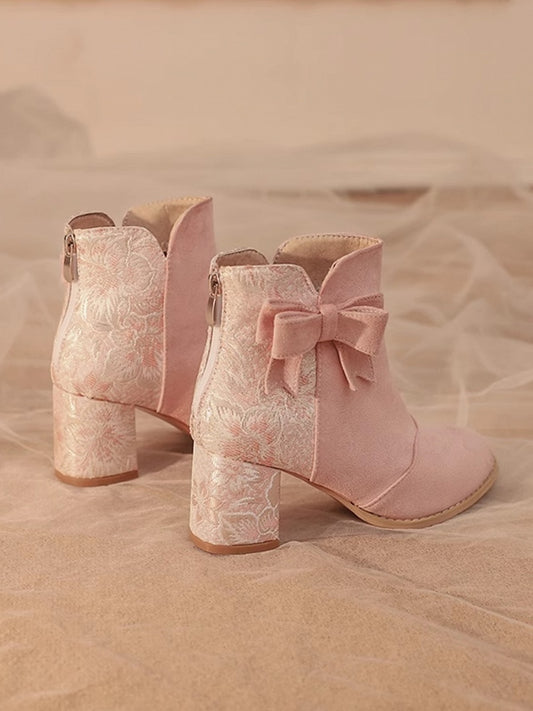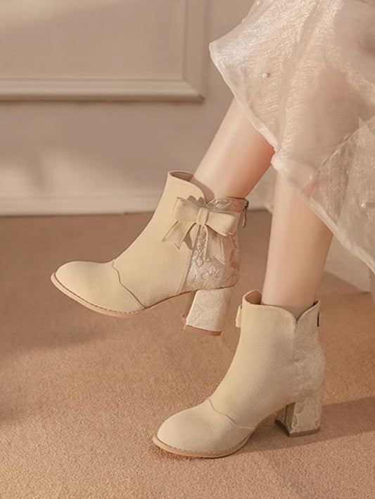Heel Version Regular/Thicken Lolita with Bow Boots Qi Block Accent Satin Combination and Suede