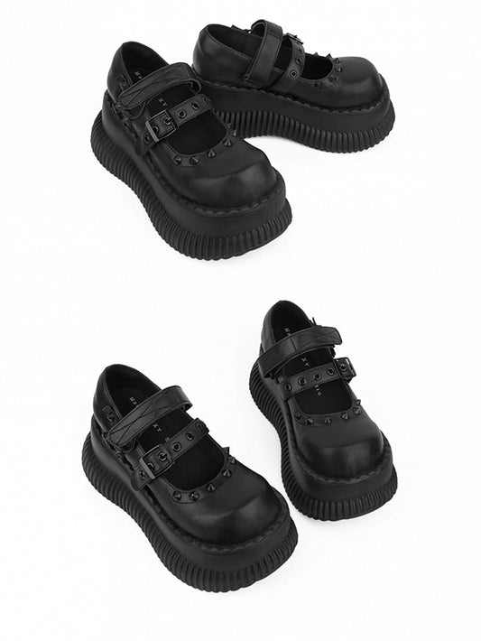 Style Straps Jane Shoes Punk Details and Studs Mary in Black Velcro with Platform Buckle