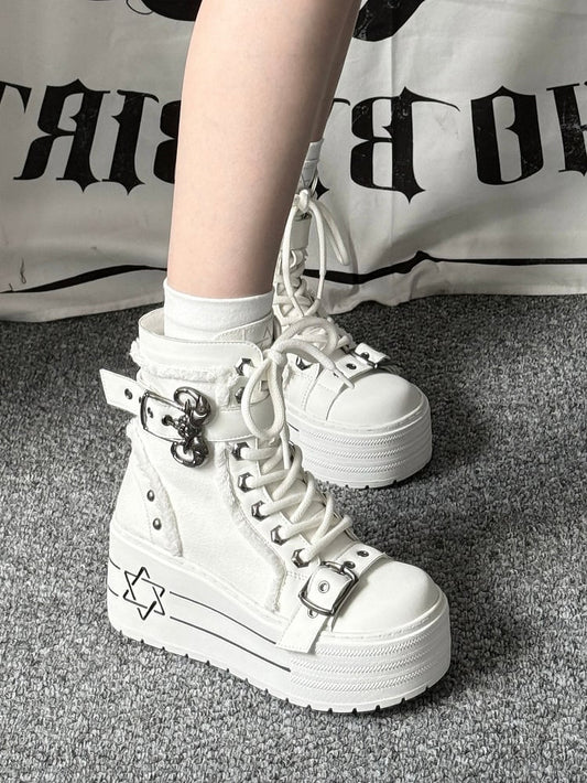 White Style Boots - Hexagram Bullhorn Punk Front Canvas Upper with Lace-Up Clasp Platform