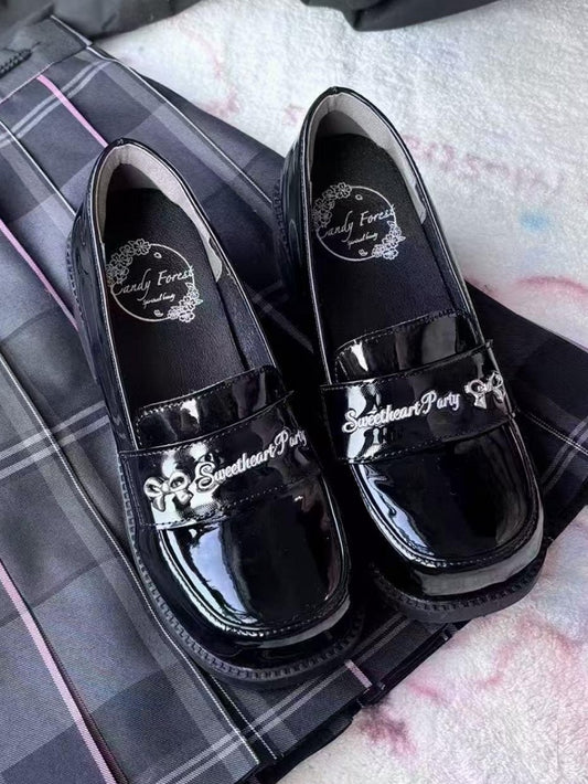 Black Sweet Lolita Flat Shoes with Bow Accents & Heart-shaped Snap