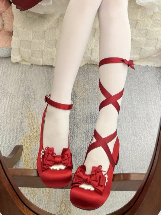 Sweet Red Lolita Low-heel Mary Jane Shoes in Satin with Lace-up at Ankle, Detachable Ankle Strap & Heart Fastener