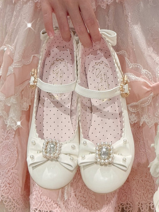 Round Lolita Rhinestone Mary Toe Decorated Details White And Beaded Bowknot Janes Shoes