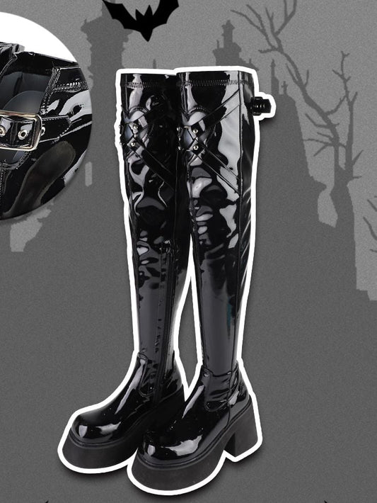 Polished Black Heart-shaped Cutout Detail Gothic Thigh-high Boots