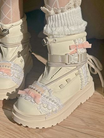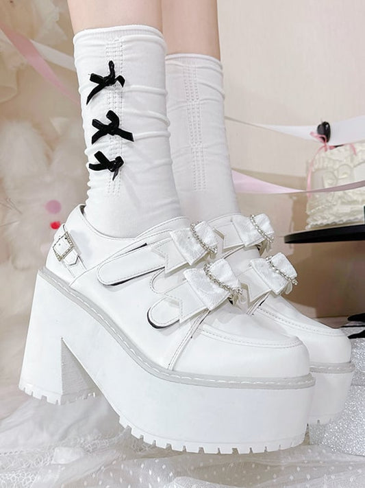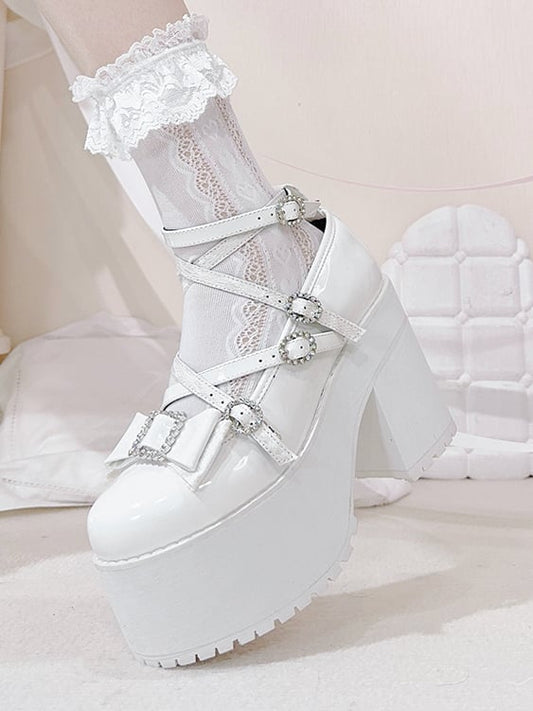 Polished White Jirai Kei Rhinestone Bowknot Landmine Style Platform Shoes