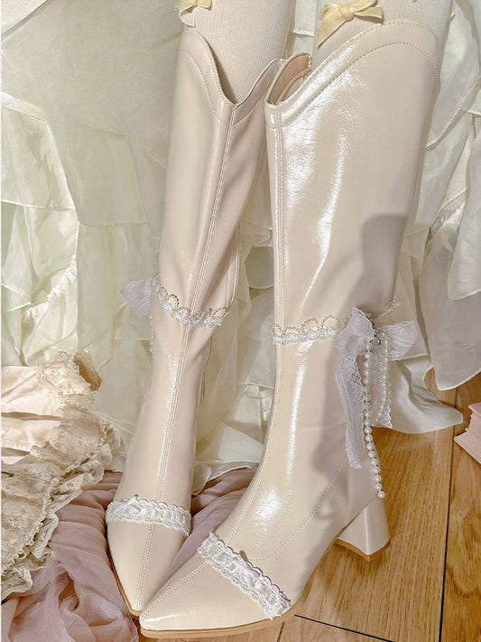 Beige Pointed Toe Laceand Beaded Chain Block Heel Knee-high Boots