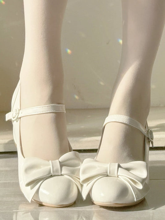 4cm Heeled Elegant Lolita Waxed White Mary Jane Shoes - Bow Decor & Round Snap