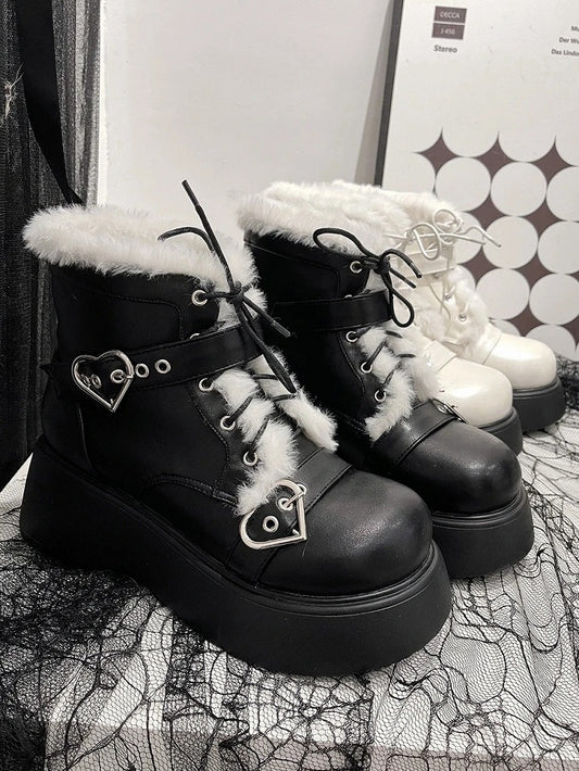 Lining Front Platform Punk Fastener Lace-Up Decorative Plush with White Heart Boots in Style Inner PU