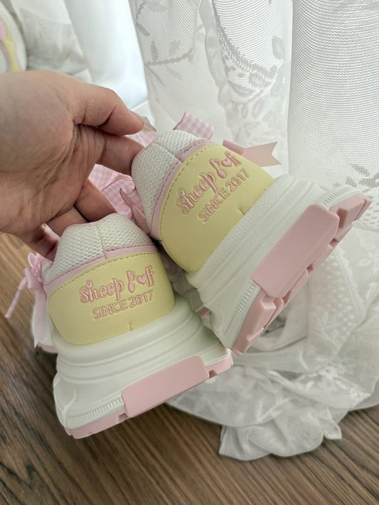 Design - Pink Lolita Platform Sneakers Lace-Up Star with Sweet Accents White Bow Plaid