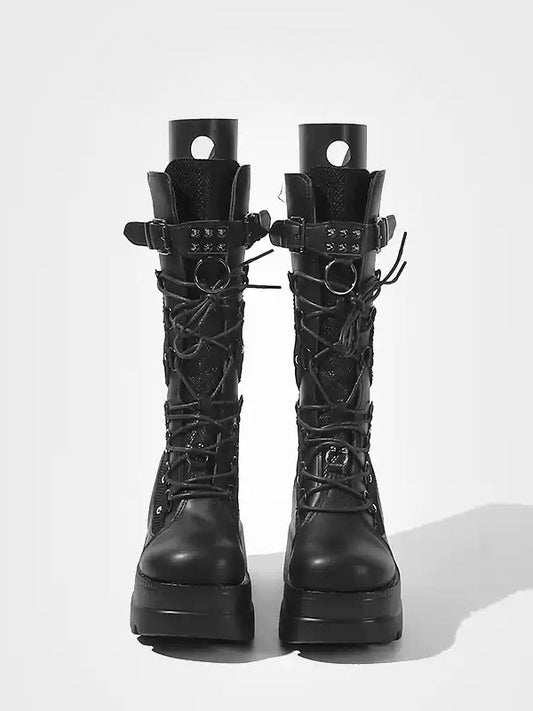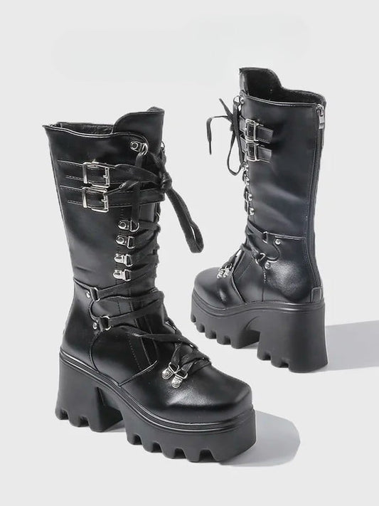 Chunky Lace-Up Heel Closure Dual System Punk on with Platform - Inner Buckle Zip Boots Black