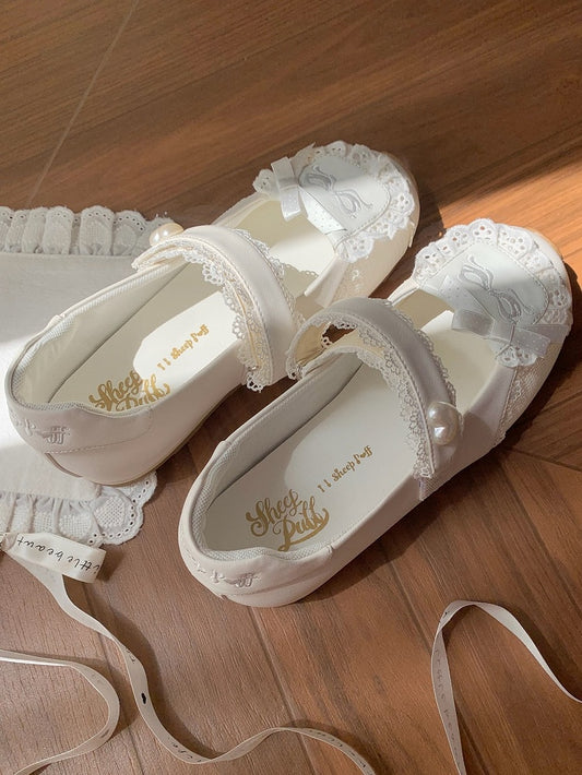 Heart-Adorned Bow Velcro Trim Sweet - Details Flat Lolita Lace Straps White Shoes