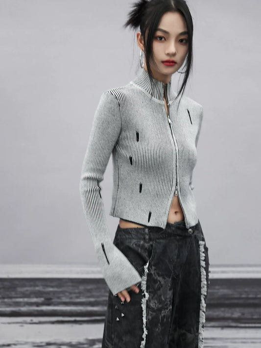 Zipper Half Neck Ribbed Knit Tops
