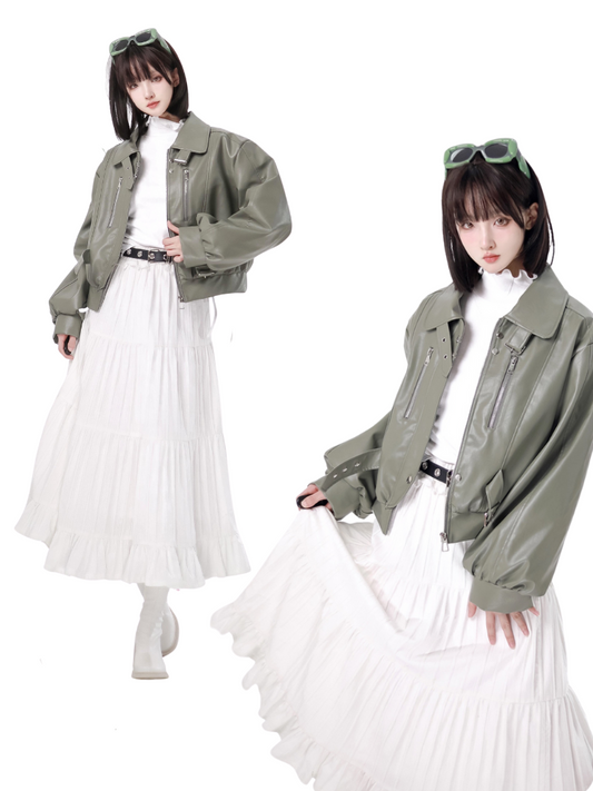 Fresh Green Silver Fox Bell Bet Leather Jacket Tops Skirt